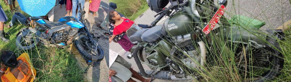 आज दिउँसो ४;३० बजे हुलाकी सडकखण्डमा कुन्जीबारीबाट गौरीगञ्जतर्फ आउँदै गरेको प्र१–०२–०४२ प ३८३७ न.को मोटरसाइकल र बिपरीत दिशातर्फ जाँदै गरेको प्र१–०१–०१७ प२६९२ नम्बरको मोटरसाइकल एकापसमा ठक्कर खाई दुर्घटना भएको हो । दुर्घटनामा प्र१–०१–०१७ प २६९२ न.को मोटरसाइकल चालक मोरङ रंगेली नगरपालिका घर बताउने २७ वर्षीय राजकुमार खत्वे, सोही मोटरसाइकलमा पछाडी सवार गौरीगञ्ज ३ बस्ने ५५ वर्षीया निरु खत्वे र प्र १–०२–०४२ प ३८३७ नं को मोटरसाइकलका चालक मोरङ रतुवा नगरपालिका ५ बस्ने रमेश मैनाली घाइते भएका हुन् ।