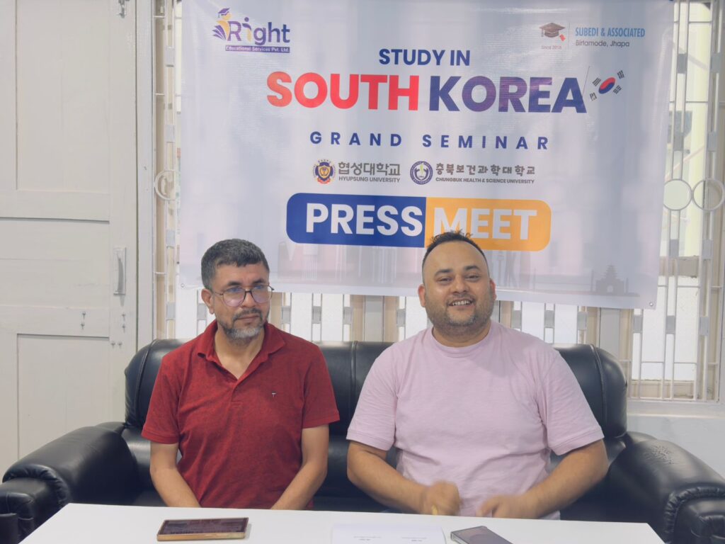दक्षिण कोरियाका विश्वविद्यालयमा अध्ययनका लागि जान चाहने बिद्यार्थी र अभिभावकलाई जानकारी दिने उद्धेश्यले यही भदौं २४ गते बिर्तामोडमा सेमिनार आयोजना गरिएको छ । सुवेदी एण्ड एसोसिएट बिर्तामोड र राइट एजुकेशनल सर्विसेज प्रालिद्वारा संयुक्तरुपमा सो सेमिनार आयोजना गरिएको आज बिर्तामोडमा पत्रकार सम्मेलन गरी जानकारी दिइएको छ ।