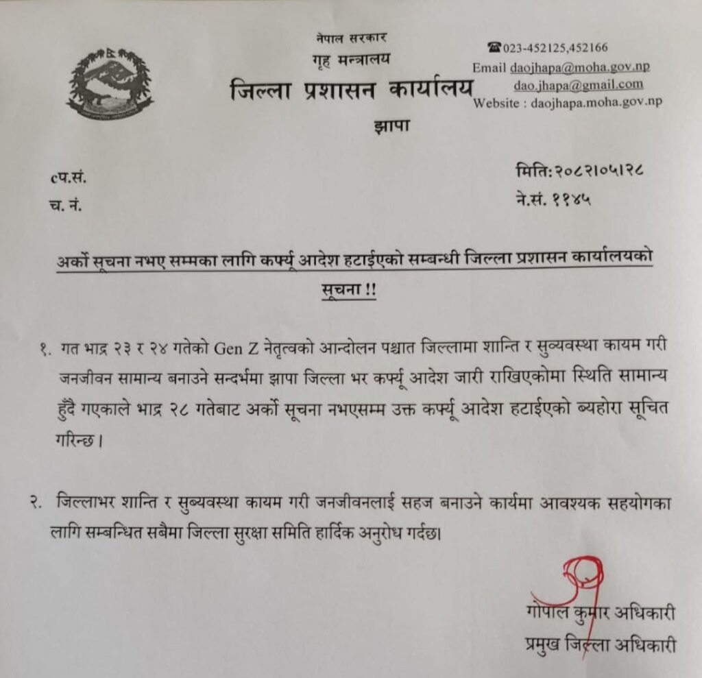 आज बिहान झापाका प्रमुख जिल्ला अधिकारी गोपालकुमार अधिकारीको अध्यक्षतामा जिल्ला सुरक्षा समितिका सदस्यहरुको उपस्थितिमा समितिको बैठक बसी कफर्यु हटाउने निर्णय गरेको हो ।