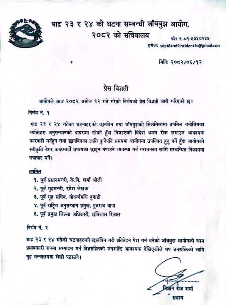 आयोगले पूर्वप्रधानमन्त्री ओली, पूर्वगृहमन्त्री रमेश लेखक, पूर्वगृहसचिव गोकर्णमणि दुवाडी, राष्ट्रिय अनुसन्धानका पूर्वप्रमुख हुतराज थापा र काठमाडौंका पूर्वसीडीओ छवि रिजालको पासपोर्ट रोक्का गर्न सिफारिस गरेको हो ।