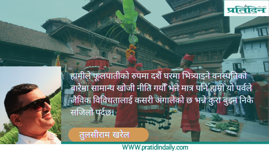 मानव समाज इतिहासदेखि वर्तमानसम्म जैविक विविधतासँग अन्तरघुलित भएर रहेको छ। जैविक विविधताका मुख्य तीन आयामहरू आनुवांशिक विविधता, प्रजातीय विविधता र पारिस्थितिक प्रणालीय विविधताको जालोभित्र उभिएर नै मानव सभ्यताको जग तयार भएको हुन्छ। जैविक विविधताको कुरोलाई दशैंको परिप्रेक्षमा नियाल्दा हाम्रो अत्यन्तै परिष्कृत र वैभवपूर्ण संस्कृतिको समेत उजागर हुन पुग्दछ। हिन्दू कुश हिमालय क्षेत्रबाट बहने अनेकौं नदीहरूका किनारमा विकास भएको सभ्यतामा रमाएका यो क्षेत्रका मानिसहरूका कृषि उपज तथा आयुर्वेदिक वनस्पतिहरूको बडादशैंमा व्यापक प्रयोग भएको कुरा हामीले भुल्नु हुँदैन। बडादशैं पर्व घटस्थापनाबाट सुरु हुन्छ। घटस्थापनाको दिन नवदुर्गा भवानीको स्थापना गरिन्छ। दियो, कलश, गणेशको स्थापनासँगै घडामा पानी राखी दशैँ कोठामा जमरा राखिन्छ। जौ, गहुँ, मकै तथा अन्य केही खाद्यबालीका बीउलाई अत्यन्त पवित्र स्थानबाट दशैं घरमा ल्याइएको माटो भरिएका स–साना भाँडा या शुद्ध टपरीहरुमा छर्ने काम गरिन्छ। गणेश स्थापनासँगै नरिवल या अन्य कुनै फल राखिन्छ। गणेशजीलाई पूजा अर्चना गर्न दुबोको प्रयोग गरिन्छ। यस पद्धतिले हामीले खाद्यबालीमा प्रयोग गर्दै आएका जौ, गहुँ ,मकै, धानलाई नै जमराको रुपमा प्रयोग गर्नुले ती खाद्य बालीहरूप्रति गरिएको अत्यन्त ठूलो श्रद्धा तथा समर्पणको रुपमा बुझ्न सकिन्छ।