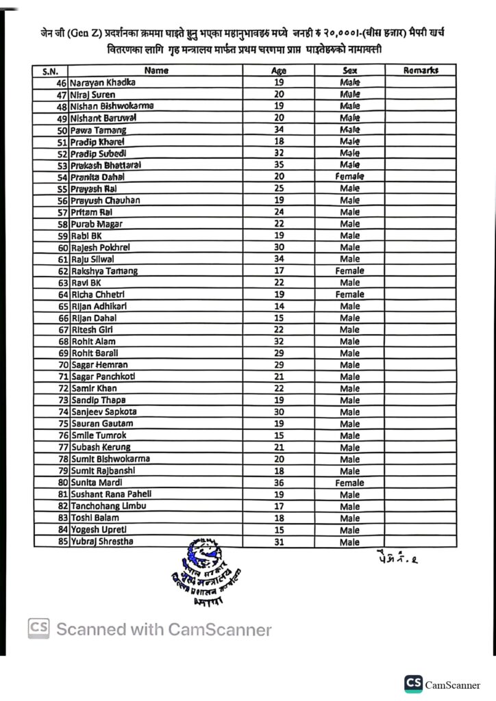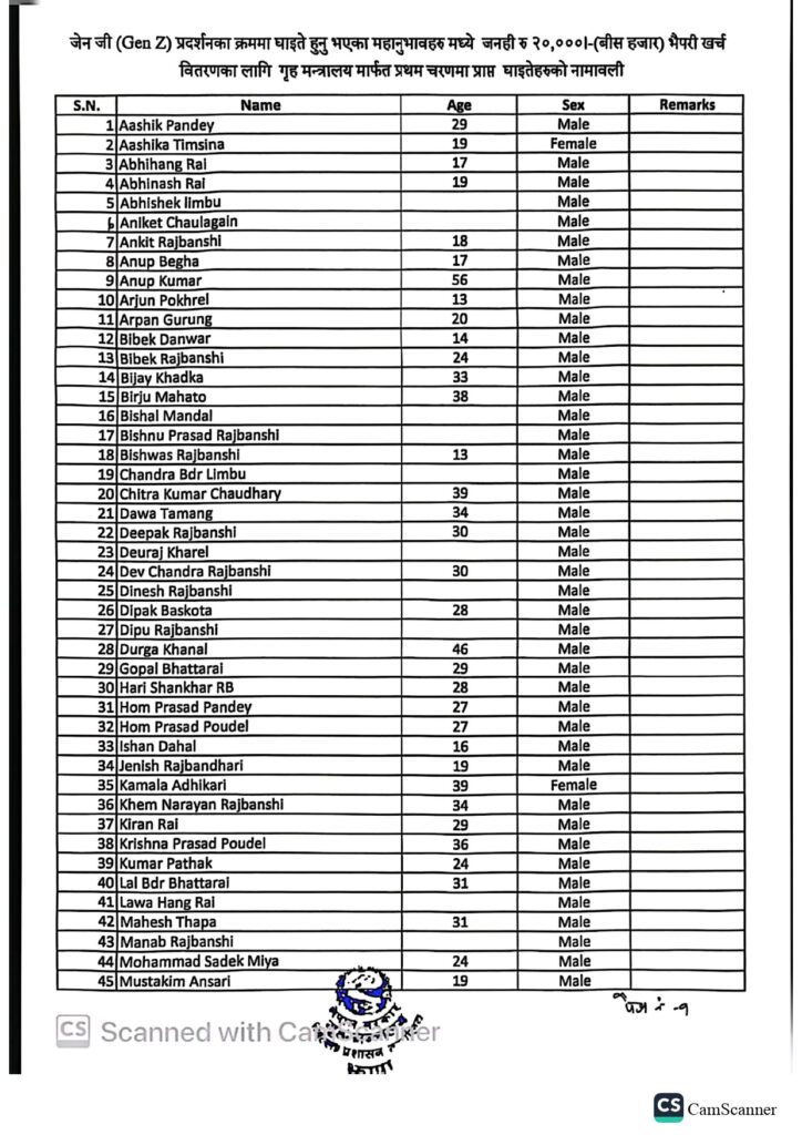 यसअघि १७३ जना घाइते भएको भनिएकोमा कतिपयको नाम दोहोरिएकाले सम्बन्धित अस्पतालहरुबाट प्रमाणित गरी जिल्ला प्रशासन कार्यालय झापाले भदौ २३ र २४ गतेको जेनजी आन्दोलनका क्रममा घाइते भएका ८५ जनाको नामावली प्रथम चरणमा प्रकाशित गरेको हो । ती घाइतेहरुका लागि तत्कालका लागि भैपरी खर्च वापत प्रतिव्यक्ति रु २० हजारका दरले उपलव्ध गराउन गृह मन्त्रालयबाट रकम प्राप्त भएको छ।