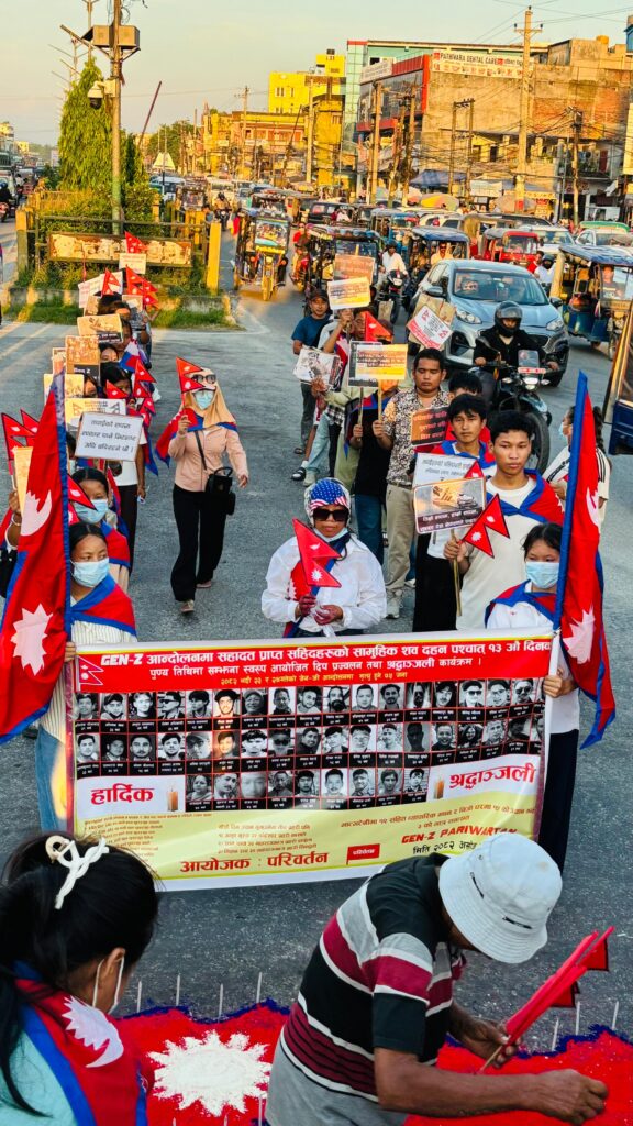 झापा, असोज १४ । जेनजी आन्दोलनमा शहादत प्राप्त शहीदहरुको १३ औं दिनको पुण्य तिथिमा बिर्तामोडमा मौन र्याली तथा श्रद्धाञ्जली सभा गरिएको छ ।