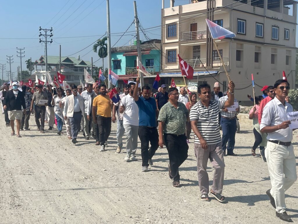 नेकपा एमाले बिर्तामोड नगर कमिटीको आयोजना तथा नगर अध्यक्ष सुवास भट्टराईको अध्यक्षतामा नेता हरिचरण सिवाकोटीलगायत पार्टीका कार्यकर्ता र्यालीमा सहभागी थिए । उनीहरुले ‘भ्रष्टाचार छानबिन गर , बैदेशिक हस्तक्षेप बन्द गर , फरार कैदी बन्दी पक्राउ गर, कानुनी राज्यको सुनिश्चितता गर , नेकपा एमाले जिन्दावाद, वीर शहीदहरु अमर रहुन्’ जस्ता नाराहरु लगाउँदै र्यालीपछि कोणसभा गरेका थिए ।