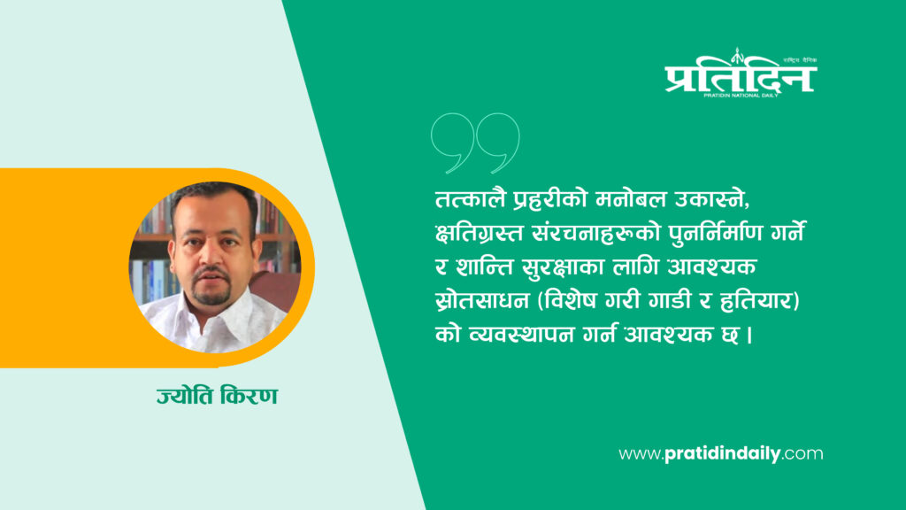 यस चुनौतीको सामना गर्न तत्कालै प्रहरीको मनोबल उकास्ने, क्षतिग्रस्त संरचनाहरूको पुनर्निर्माण गर्ने र शान्ति सुरक्षाका लागि आवश्यक स्रोतसाधन (विशेष गरी गाडी र हतियार) को व्यवस्थापन गर्न आवश्यक छ। तर, दीर्घकालीन समाधानका लागि राज्यले युवा पुस्ताको निराशालाई सम्बोधन गर्नुपर्छ, राजनीतिक नेतृत्वले जनमतको सम्मान गर्दै भ्रष्टाचार नियन्त्रण गर्नुपर्छ र सबै सरोकारवालासँग समन्वय गरेर सुरक्षित र समावेशी समाज निर्माणको दिशामा अघि बढ्नुपर्छ। नत्र, अस्थिर राजनीति र क्षयीकृत सुरक्षा संयन्त्रले मुलुकलाई आन्तरिक असुरक्षाको भुमरीमा फसाउन सक्छ।
