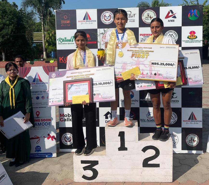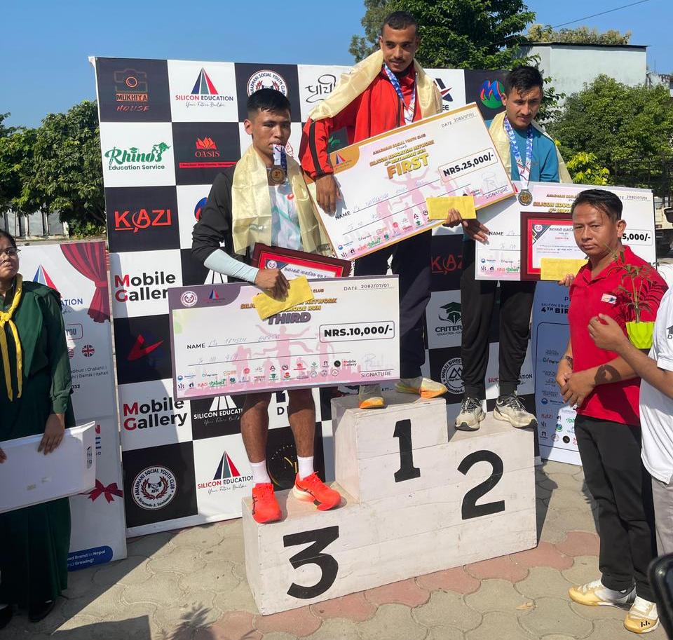 अनारमनी सामाजिक युवा क्लबको आयोजनामा आज बिहान भएको सो दौड प्रतियोगितामा पुरुषतर्फ प्रथम हुँदै नरेन्द्रसिंह राउतले नगद २५ हजार , मेडल र प्रमाणपत्र पाएका छन् । त्यस्तै दोस्रो भएका कुलबहादुर बस्नेतले १५ हजार , मेडल र प्रमाणपत्र तथा तेस्रो भएका तेन्जिन शेर्पाले १० हजार मेडल र प्रमाणपत्र पाएका छन् ।