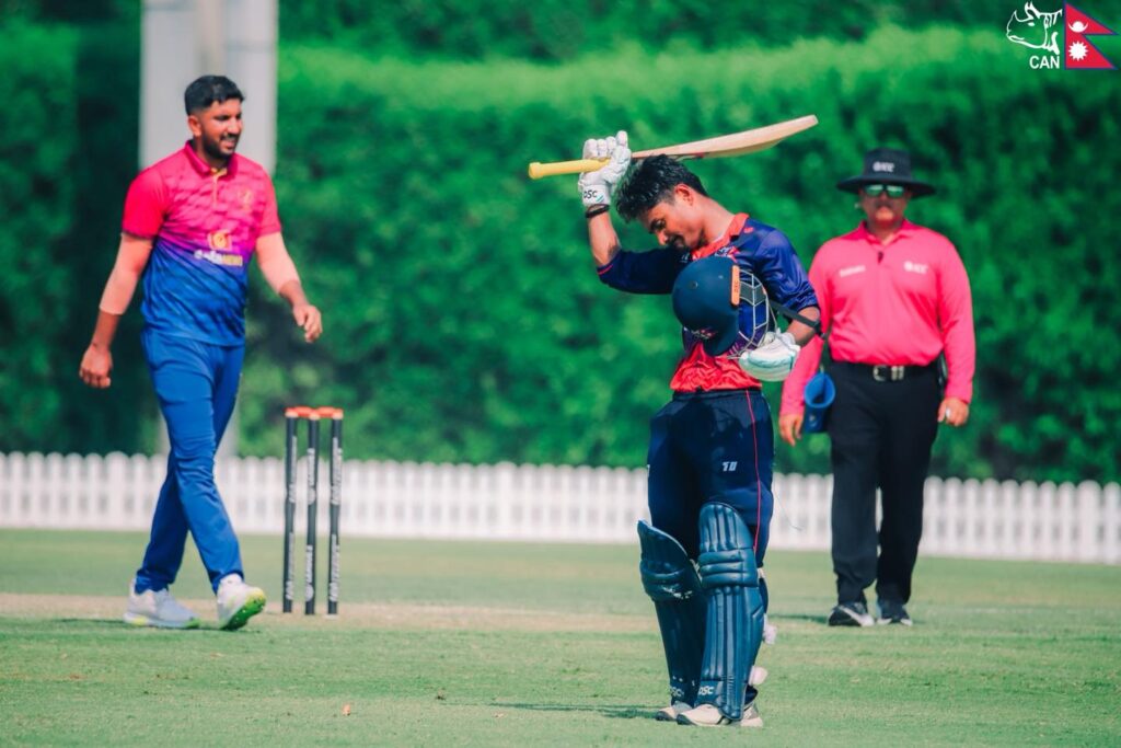 त्यसअघि ब्याटिङ गरेको नेपालका लागि कप्तान रोहित पौडेलले १३० बलमा ५ चौका र २ छक्कासहित १०९ रनको शतकीय पारी खेलेका थिए। ओपनर आसिफ शेखले ३५ रन बनाए। आरिफ शेखले २७ रन बनाए। आरिफले कप्तान रोहितसँग चौथो विकेटको लागि ७० रनको अर्धशतकीय साझेदारी गरेका थिए।