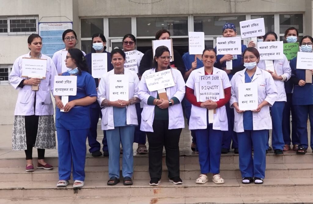नर्सिङ संघले अघि सारेको १५ बुँदे मागलाई पूरा गर्नुपर्ने भन्दै शुक्रबार देशभरका अस्पतालका नर्सहरूले प्रदर्शन गरेका छन् । स्वास्थ्य तथा जनसंख्या मन्त्रालयको २०८२÷०६÷२४ को पत्र कार्यान्वयन गरी स्वास्थ्यकर्मीहरूको न्यूनतम पारिश्रमिक सरकार सरह नघट्ने गरी दिनुपर्ने, अतिरिक्त कार्यवापत भत्ता दिनुपर्ने, ज्यालादारीमा नचलाउने र तलब–भत्ता बैंकिङ प्रणालीमार्फत भुक्तानी गर्नुपर्ने उनीहरुको माग छ ।