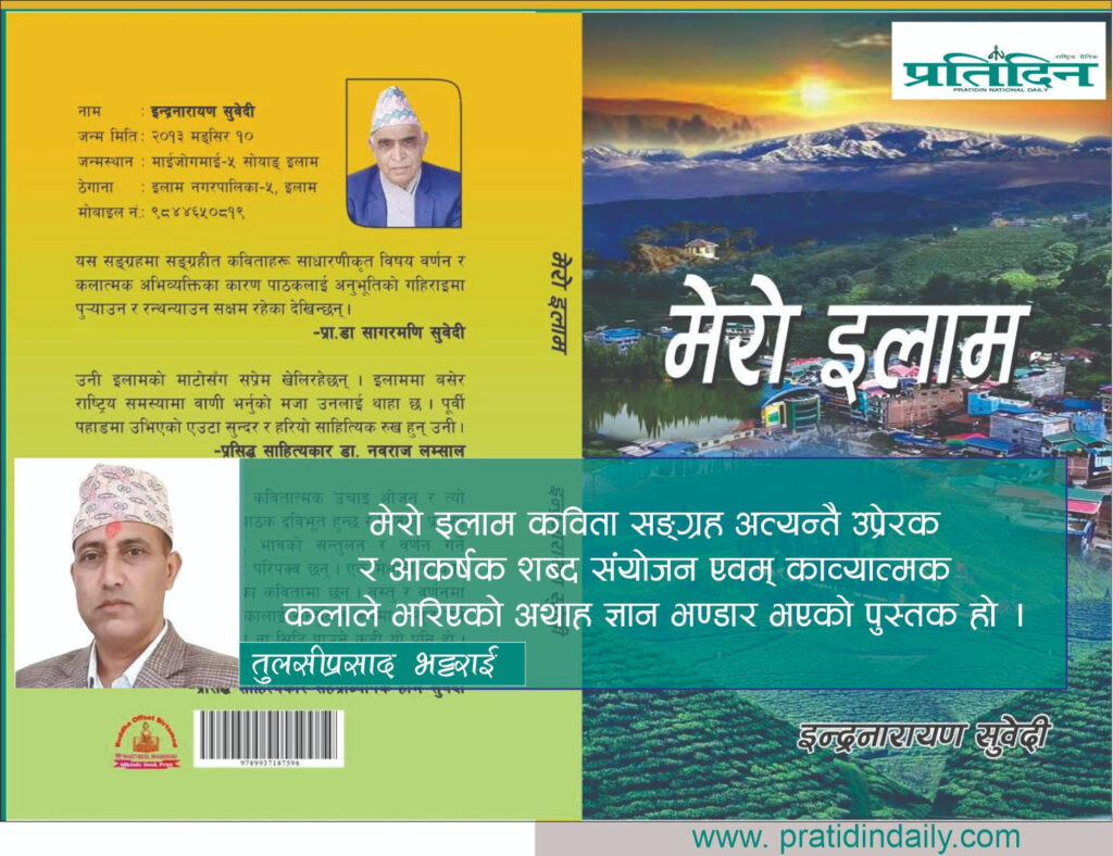 उल्लिखित उदाहरणहरू मैले यस पुस्तक भित्र भएका सयौँ श्लोकहरू मध्येबाट आंशिक रूपमा छानेर केही मात्र लिएको हुँ । मेरो इलाम कविता सङ्ग्रह अत्यन्तै उप्रेरक र आकर्षक शब्द संयोजन एवम् काव्यात्मक कलाले भरिएको अथाह ज्ञान भण्डार भएको पुस्तक हो । यो मेरो इलाम कविता सङ्ग्रह प्रकाशन गरेर नेपाली साहित्य जगतमा कवि इन्द्रनारायण सुवेदीले पु¥याउनु भएको योगदानलाई उच्च मुल्याङ्कन गर्दै हार्दिक सम्मान व्यक्त गर्दछु । यो सराहनीय कार्यको लागि हर्कबढाइँका साथ हार्दिक बधाई एवम् उत्तरोत्तर प्रगतिको अनगिन्ती शुभकामना व्यक्त गर्दछु, धन्यवाद !