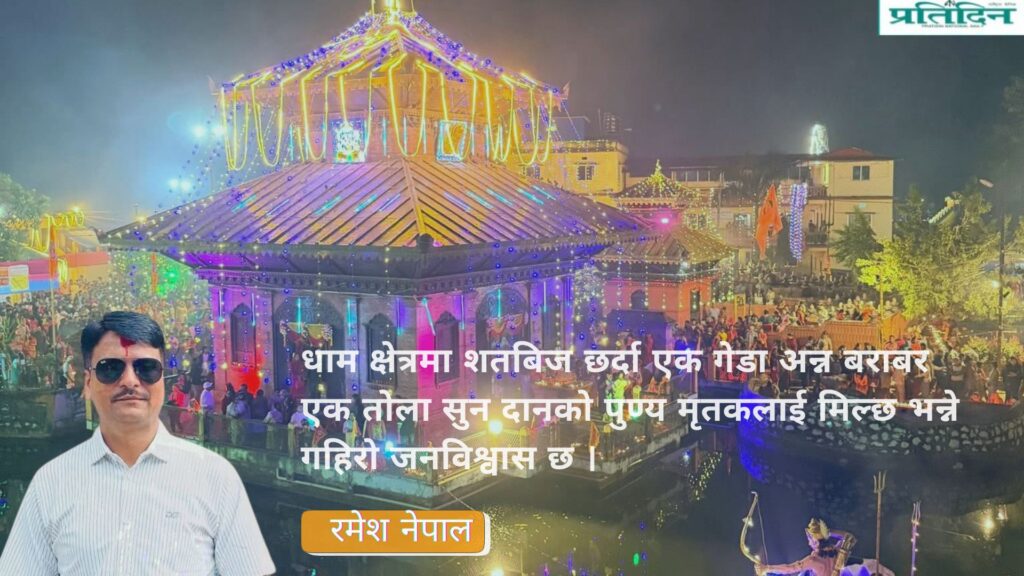 त्रयोदशीका दिन राति अर्जुनधारा खासगरी मुख्य मन्दिर आसपासमा दीप महादीप बालिदिएमा जीवात्मा कुनै कारणवश शून्यमा मार्ग नपाई अन्धकारमा भड्किरहेका भए पनि त्यस दीपका प्रकाशले मार्ग पाई पितृलोकमा जान सक्छ र धाम क्षेत्रमा शतबिज छर्दा एक गेडा अन्न बराबर एक तोला सुन दानको पुण्य मृतकलाई मिल्छ भन्ने गहिरो जनविश्वास छ ।