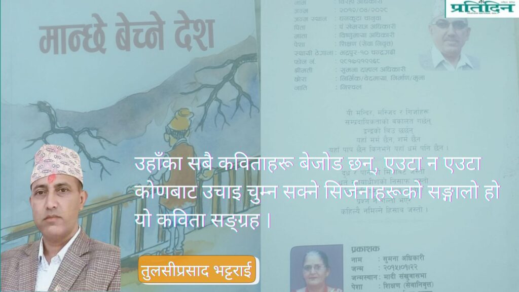 प्रस्तुत कविता “मान्छे बेच्ने देश” कविता सङ्ग्रह भित्रबाट लिएको एउटा अंश हो । वि. सं. २०८२ असोज २५ गते लेखनाथ पुस्तकालय भद्रपुरमा लोकार्पण गरिएको उक्त पुस्तक, लेखक कवि विरही अधिकारीको एघारौँ प्रकाशित कृति हो । सुमना अधिकारीले प्रकाशन गर्नुभएको यस पुस्तकमा साहित्यकार प्रा. डा. गङ्गाप्रसाद अधिकारीले भूमिकात्मक निरुपण गर्दै लेखमा शुभकामना व्यक्त गर्नुभएको छ ।
