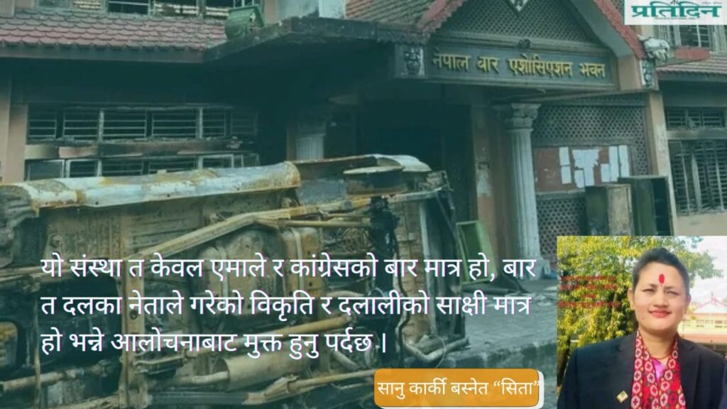 त्यस्तैगरी एकातिर नेपाल बार एसोसिएसन (नेबाए) पनि जनताको बार हुन सकेको छैन। यो संस्था त केवल एमाले र कांग्रेसको बार मात्र हो, बार त दलका नेताले गरेको विकृति र दलालीको साक्षी मात्र हो भन्ने आलोचनाबाट मुक्त हुनु पर्दछ । अर्कोतिर नेबाएमा आवद्ध कानुन व्यवसायीको पनि व्यवहार र चरित्र पारदर्शी, जनविश्वासी र सम्मानयोग्य छ छैन? दलाली, घुसखोरी, स्त्रीलम्पट चरित्रहीन व्यक्ति नेबाए संस्थाको नेतृत्वमा वा सस्था वरिपरि तर मार्न, राजनीतिक भागबन्डा लिन, पेशाको मर्यादाविपरित हिँडेको भन्ने आरोप छ। त्यस्ता आचरणहीन वकिललाई चिनेर दण्डको दायरामा ल्याउनुपर्ने समेत देखिन्छ। जसका लागि नेबाएको वर्तमान नेतृत्वको विकल्पमा युवा पुस्ताको आमन्त्रण जरुरी छ।