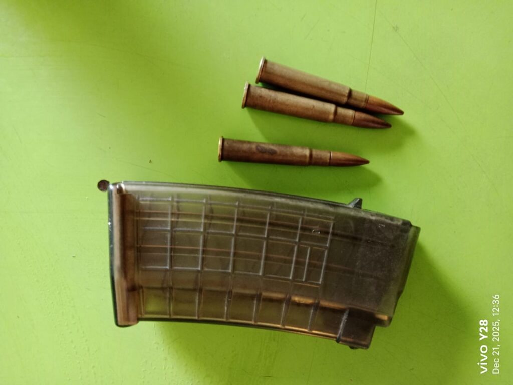 हिजो दिउँसो १२;२५ बजे बिर्तामोड वडा न.६ स्यालडाँगीस्थित चिया बगानमा ईन्सास राईफलको म्याग्जिन एक थान र मार्का थ्री राईफलको गोली–३ राउण्ड (सावुत) बेवारिसे अबस्थामा फेला परेको हो ।