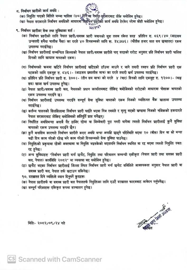 निर्वाचन प्रहरी भर्ना छनोट तथा नियुक्ति समितिले आज एक सूचना जारी गरी भर्ना खुलेको जानकारी दिएको हो । नेपाल प्रहरी र सशस्त्र प्रहरी, बल नेपालका लागि झापामा ४७९७ जना निर्वाचन प्रहरीको दरबन्दी तोकिएको छ ।