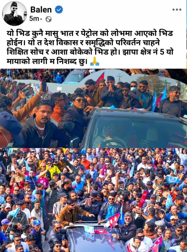दमकस्थित ५ नं निर्वाचन कार्यालयमा उम्मेदवारी दर्ता गराएपछि उत्साहित भएका बालेनले देश विकास र समृद्धिको परिवर्तन चाहने शिक्षित सोच र आशा बोकेको भीड भएको बताएका छन् । सामाजिक संजालमार्फत आभार व्यक्त गर्दै उनले लेखेका छन् ,‘ झापा क्षेत्र नं ५ को मायाको लागि म निशव्द भएको छु ।’