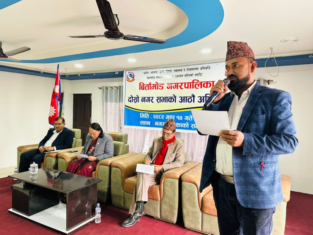 नगरपालिकाको दोस्रो नगरसभाको आठौँ अधिवेशनको समापन कार्यक्रमअन्तर्गत आयोजित खुलासत्रमा बोल्दै वडा नम्बर २ का वडाध्यक्ष किशोर पौडेलले वडा विभाजनको माग गर्दै विशेष प्रस्ताव प्रस्तुत गरेका हुन् ।