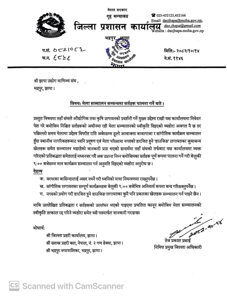 महोत्सवको स्वीकृति पत्रमा जिल्ला प्रशासन कार्यालय झापाले समयको कुनै सीमा तोकेको थिएन । माघ १३ गते आयोजक झापा उद्योग वाणिज्य संघलाई विविध शर्तसहित बेलुकाको ७ बजेसम्म महोत्सव संचालन गर्न पत्र पठाइएको थियो ।