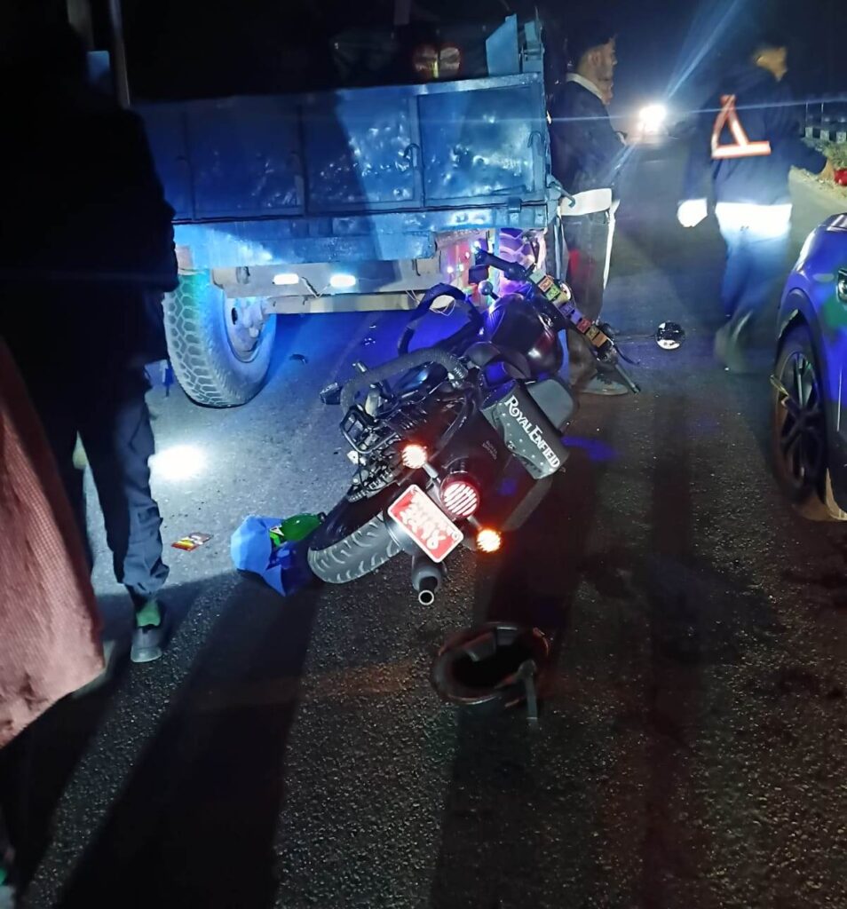 दुई दिनअघि माघ २४ गते राति ८ः३० बजे बुद्धशान्ति गाउँपालिका वडा न. २ इन्द्रेणी चोकस्थित भित्री सडकखण्डमा बुधबारेबाट जयपुरतर्फ जाँदै गरेको प्र.१–०१–०१७ प ३५१४ नम्बरको मोटरसाइकल बाटोमा रोकिराखेको मे १ त ७७६७ नम्बरको ट्रयाक्टरको पछाडी डालामा ठोक्किएको थियो ।