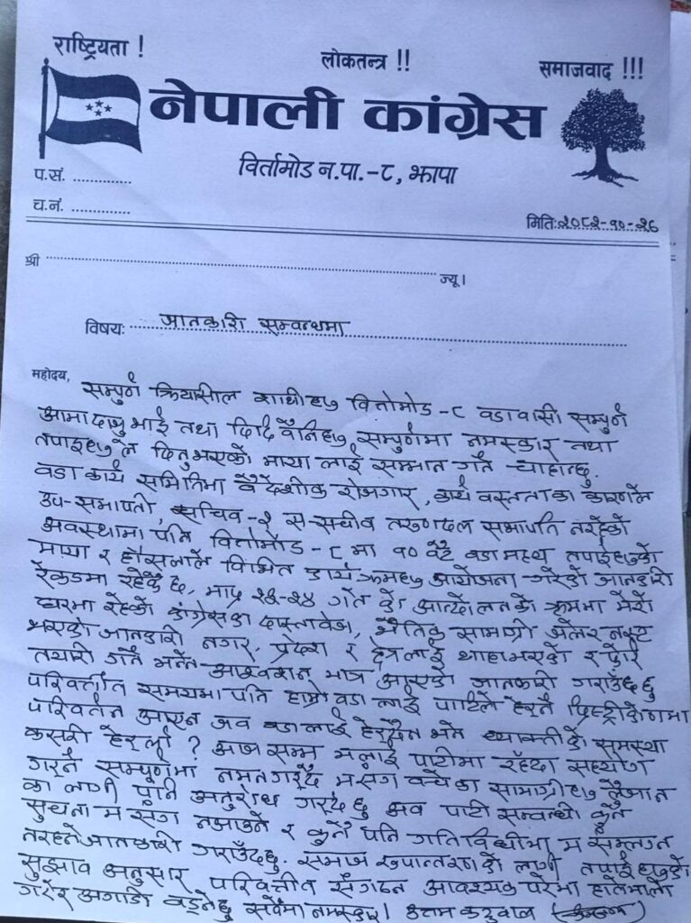 पार्टीका बिर्तामोड ८ का वडा सभापति उत्तम कटुवालले निष्क्रिय बस्ने घोषणा गरेपछि क्षेत्रीय प्रतिनिधिसहित अन्य २६ जनाले पनि सामूहिक रुपमा निष्क्रिय बस्ने घोषणा गरेका हुन् । निर्वाचनका बेला पार्टी फेरबदल भइरहँदा त्यति धेरै कांग्रेस कार्यकर्ताहरुले पार्टी छोडेको घोषणा गर्नुलाई महत्वका साथ हेरिएको छ ।