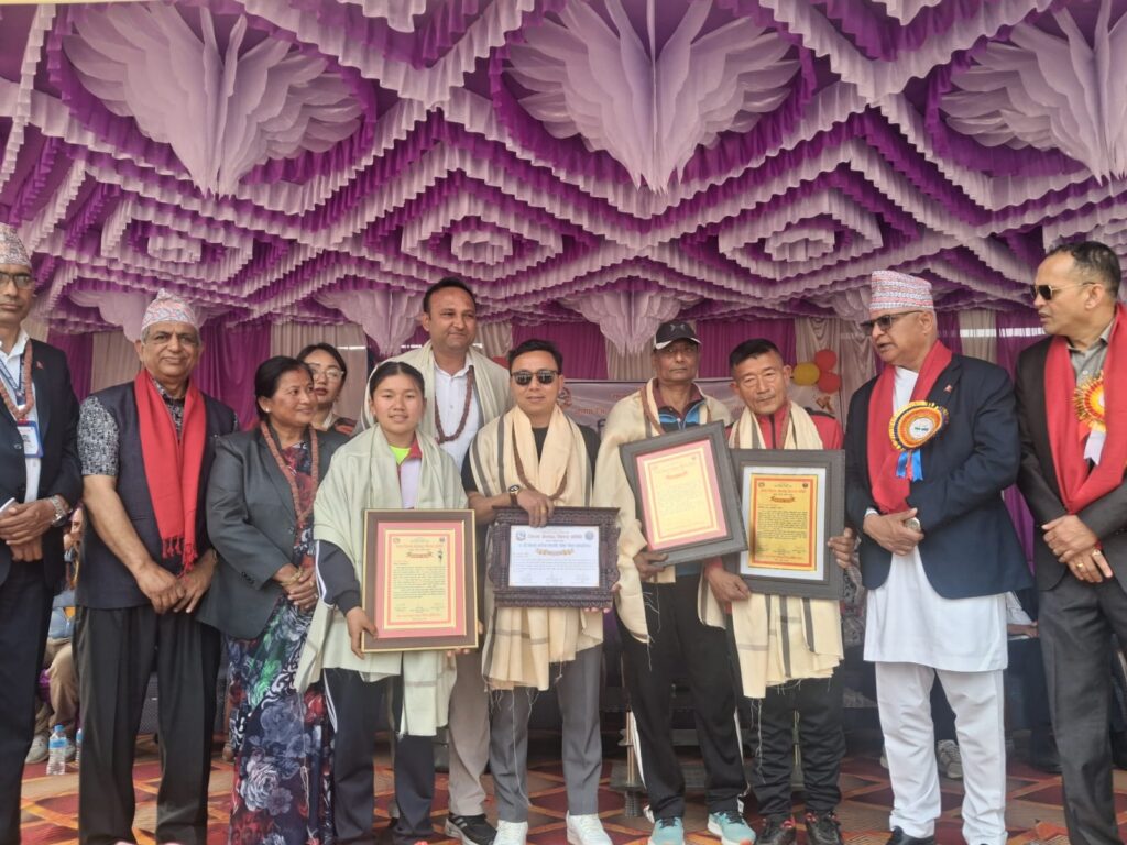 खेलाडीको रुपमा खेल क्षेत्रमा पदार्पण गरी पछि प्रशिक्षकको रुपमा खेलक्षेत्रमा योगदान पुर्याउँदै अवकाश प्राप्त गर्ने तेक्वान्दो प्रशिक्षक हरिबहादुर भुजेल र एथलेटिक्स प्रशिक्षक गोपाल यादव, त्यस्तै, एथलेटिक्सबाट विश्वमा नेपालको पहिचान बनाउन सफल अल्ट्राधाविका पुष्पा शेर्मा, झापामा पहिलो पटक महिला गोल्डकप आयोजना गरेर महिला फुटबलको विकासमा महत्वपूर्ण भूमिका निर्वाह गर्ने झापा महिला गोल्डकपका अध्यक्ष सन्तोष थोप्रा तथा संस्थागत रुपमा झापा उद्योग वाणिज्य संघलाई प्रमुख अतिथि मुख्यमन्त्री कार्की, गौरादह नगरपालिकाका प्रमुख छत्रपति सुवेदी, गौरीगञ्ज गाउँपालिकाकी अध्यक्ष फूलवती राजवंशीलगायतले दोसल्ला ओढाएर सम्मानपत्र प्रदान गरेका थिए । झापा उद्योग वाणिज्य संघको सम्मानपत्र महासचिव सुमन मैनालीले ग्रहण गरेका थिए ।