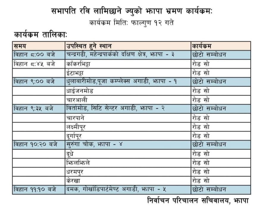 चन्द्रगढी , धुलावारी ,बिर्तामोड ,सुरुङ्गा र दमकमा उनले संबोधन गर्ने भएको निर्वाचन परिचालन सचिवालय झापाले जनाएको छ । झापाको कार्यक्रम सकेर उनी भोलि नै इटहरी जाने भएका छन् । सभापति रविसंगै वरिष्ठ नेता बालेन शाह पनि रहने जनाइएको छ ।