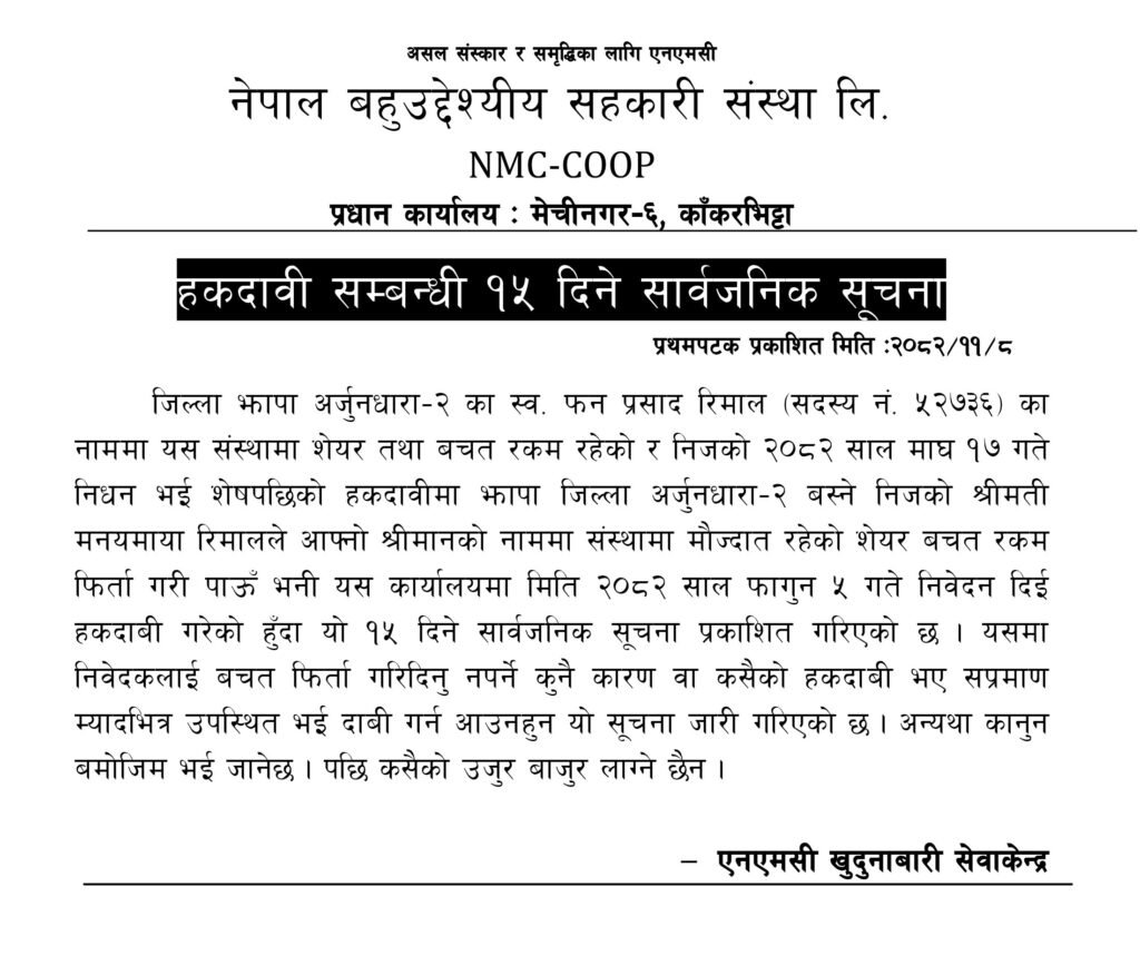 एनएमसीको हकदावी सम्बन्धी १५ दिने सूचना February 27, 2026 Views: 1 RELATED ARTICLESMORE FROM AUTHOR एनएमसीको हकदाबी सम्बन्धी १५ दिने सूचना एनएमसीको हकदावी सम्बन्धी १५ दिने सूचना एनएमसीको हकदावीसम्बन्धी १५ दिने सूचना प्रतिक्रिया Cancel reply कृपया प्रतिक्रिया लेख्नुहोस्! कृपया आफ्नो नाम लेख्नुहोस् तपाइको इमेल ठेगाना गलत छ! कृपया आफ्नो इमेल ठेगाना लेख्नुहोस्