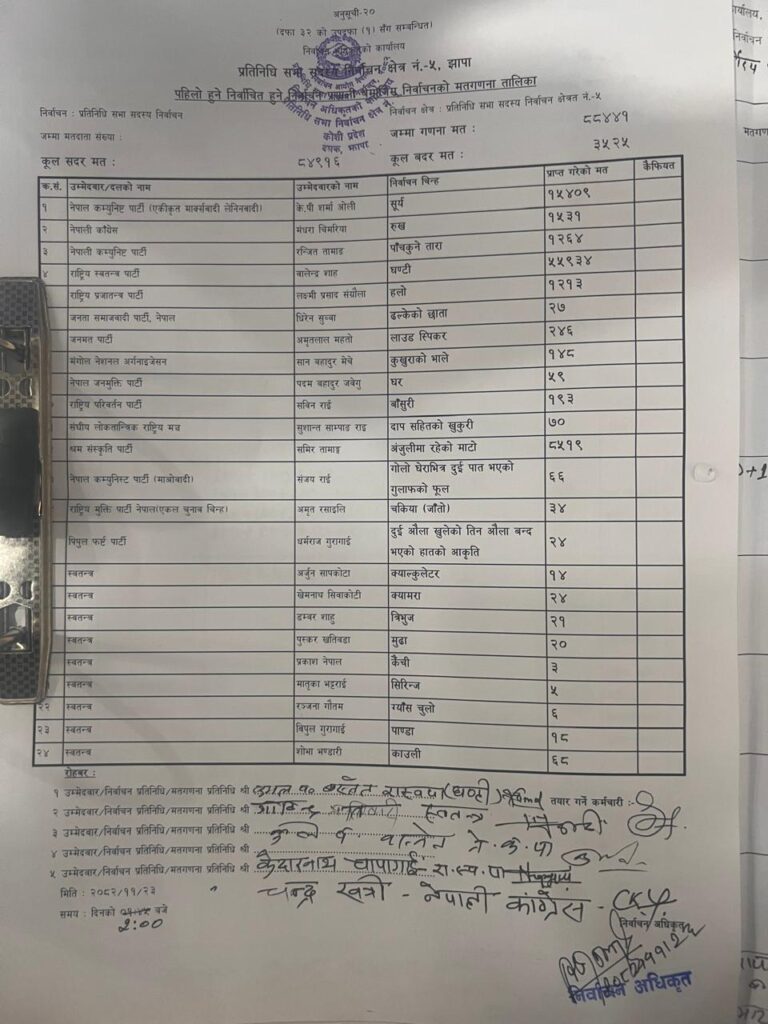 झापा ५ मा कुल १ लाख ६ हजार ३७२ मत खसेकोमा केहीबेर अघिसम्म ८८हजार ४४१ मत गणना भइसकेको छ । अब १७ हजार ९३० मत मात्र गन्न बाँकी रहेको छ । त्यसमा बालेनले ५५ हजार ९३४ मत ल्याएका छन् भने ओलीले १५ हजार ४०९ मत पाएका छन् । ओलीभन्दा बालेन ४० हजार ५२५ मतले अगाडि रहेका छन् ।