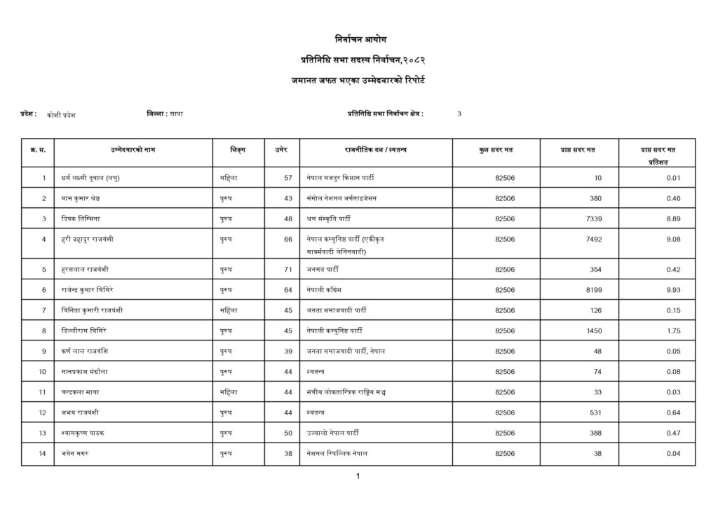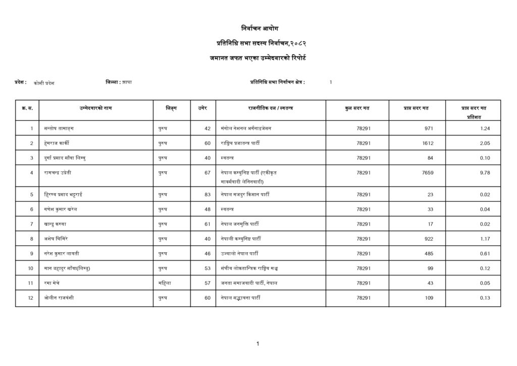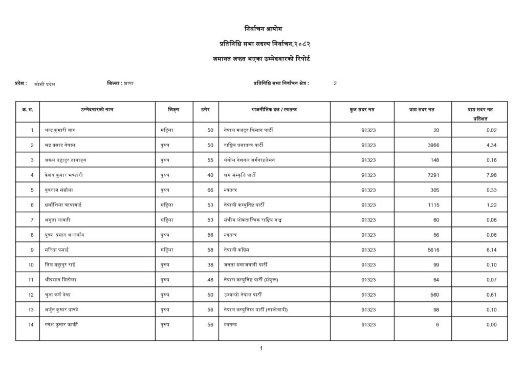 झापामा जमानत जफत हुनेहरुमा नेपाली कांग्रेस , नेकपा एमाले , राष्ट्रिय प्रजातन्त्र पार्टी , श्रम संस्कृति पार्टी , नेपाली कम्युनिष्ट पार्टीका उम्मेदवारहरु पनि छन् । झापा क्षेत्र नं १ मा १२ जना उम्मेदवारको जमानत जफत भएको छ । नेकपा एमालेका रामचन्द्र उप्रेती , राप्रपाका हेमराज कार्की , नेकपाका अशेष घिमिरेलगायतको जमानत जफत भएको छ । उनीहरुले सदर मतको १० प्रतिशत मतसमेत ल्याउन सकेनन् ।