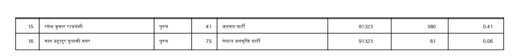 त्यस्तै क्षेत्र नं २ मा राप्रपाका भद्रप्रसाद नेपाल(स्वागत) , श्रम संस्कृति पार्टीका केशवकुमार भण्डारी , नेकपाकी धर्मशीला चापागाँईसहित १६ जना उम्मेदवारको जमानत जफत भएको छ ।