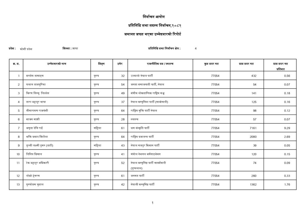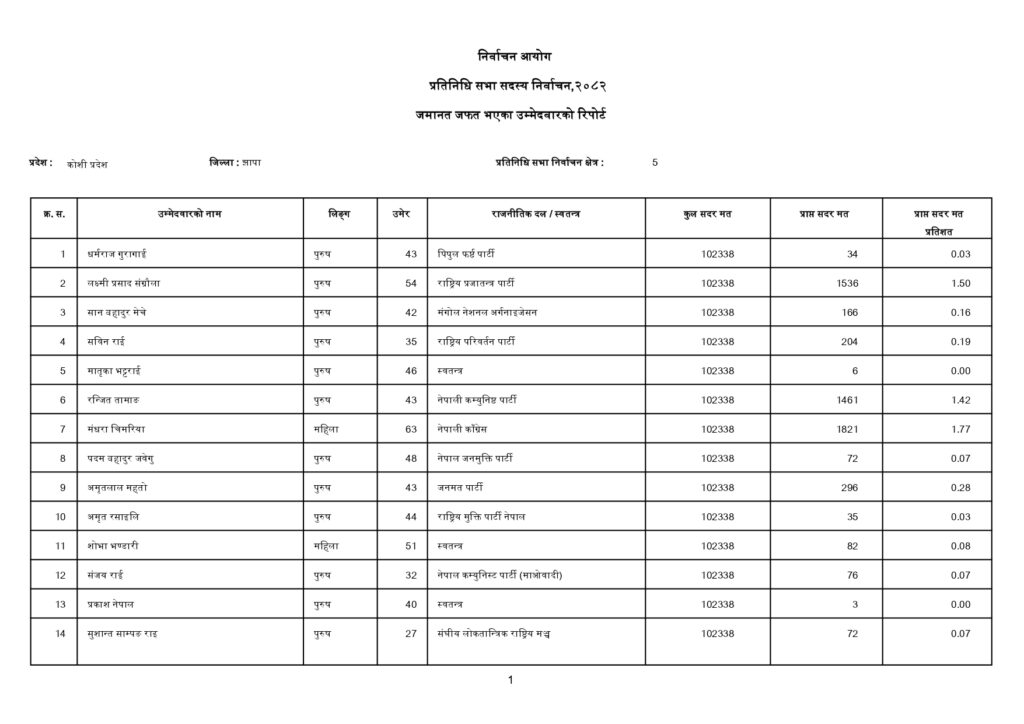 त्यस्तै क्षेत्र नं ५ मा नेपाली कांग्रेसकी मन्धरा चिमरिया , राप्रपाका लक्ष्मीप्रसाद संग्रौला,श्रम संस्कृति पार्टीका समिर तामाङसहित २२ जना उम्मेदवारको जमानत जफत भएको जिल्ला निर्वाचन कार्यालय झापाले जनाएको छ ।