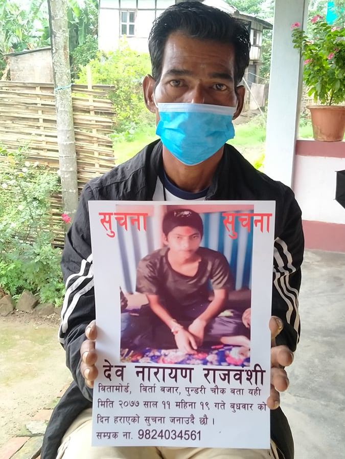 झापा , जेठ १६ । बिर्तामोड ४ बस्ने भाद्रु राजवंशीले हराएको छोरो खोज्दै भौतारिएको करीब तीन महिना पुग्न लाग्यो ।उनले आफ्ना छोरा देवनारायणलाई खोजिदिनका लागि नगुहारेको कोही पनि बाँकी छैन ।