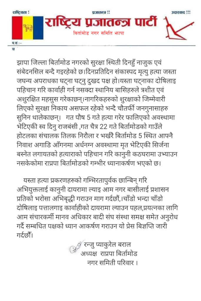 राप्रपाको बिर्तामोड नगर समितिले आज एक विज्ञप्ति जारी गरी सिर्जनाको हत्याराको पहिचान गरी कानुनी कठघरामा उभ्याउन नसकेकोमा प्रहरी प्रशासनको ध्यानाकर्षण गराएको हो ।