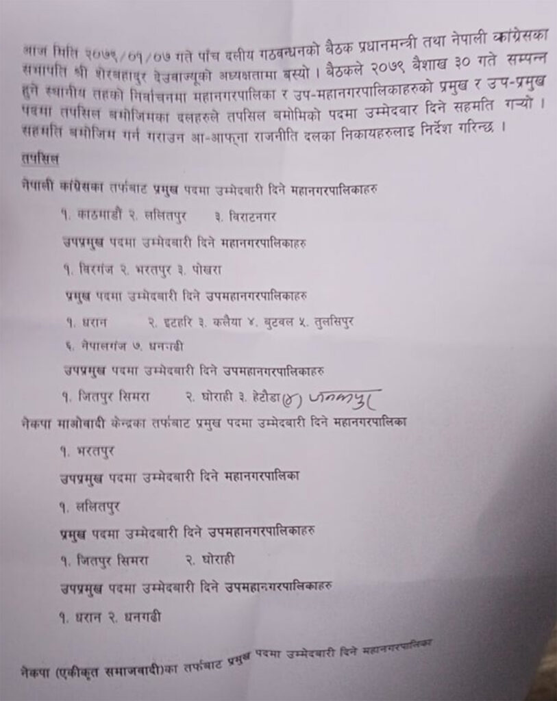 गठबन्धन दलबीच कांग्रेसले काठमाडौँ, ललितपुर र विराटनगर महानगरपालिकाको प्रमुखमा तथा वीरगञ्ज, भरतपुर र पोखराको उपप्रमुखमा उम्मेदवारी दिने सहमति भएको छ ।