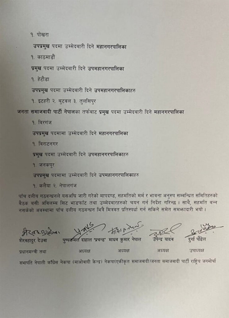 साथै, सहमति बन्न नसकेको अवस्थामा पाँचदलीय गठबन्धनभित्रै मित्रवत् प्रतिस्पर्धा गर्न सकिनेसमेत समझदारी भएको छ । सो सहमतिमा प्रधानमन्त्री एवं कांग्रेस सभापति देउवा, माओवादी केन्द्रका अध्यक्ष पुष्पकमल दाहाल, एकीकृत समाजवादीका अध्यक्ष माधवकुमार नेपाल, जनपाका अध्यक्ष उपेन्द्र यादव र राष्ट्रिय जनमोर्चाका उपाध्यक्ष दुर्गा पौडेलले हस्ताक्षर गरेका छन् ।