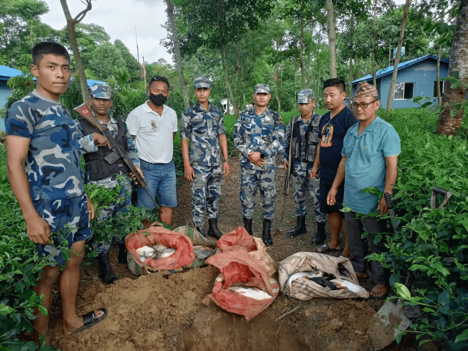 सशस्त्र प्रहरी बल नेपाल, बोर्डर आउट पोस्ट पृथ्वीनगरका इन्स्पेक्टर हेमन्त लिम्बूको नेतृत्वमा खटिएको टोलीले साविक पृथ्वीनगर गाविस हाल भद्रपुर– ३ भैसावाडीस्थित चिया बगानमा लुकाई छिपाई राखेको अवस्थामा ७० केजी बराबरको झन्डै २७ हजार रुपैयाँ बराबरको माछा बरामद गरेको हो ।