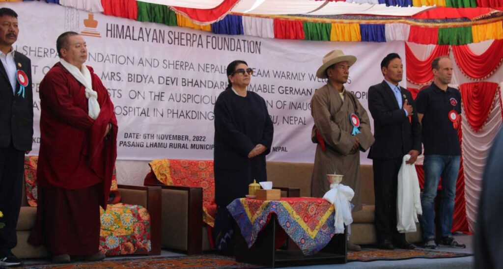 आइतबार सोलुखुम्बुको खुम्बु पासाङ ल्हमू गाउँपालिका- ३ फाक्दिङमा आयोजित कार्यक्रममा राष्ट्रपति भण्डारीले हिमालयन शेर्पा फाउण्डेशनले २० करोड लागतमा निर्माण गरेको अस्पतालको उद्घाटन गरेकी हुन्। ओपिडी, ल्याब, प्रसुती, माउण्टेन मेडिसिन सेवा सुविधा रहेको अस्पतालबाट खुम्बु पासाङ ल्हमू ३ का फाक्दिङ क्षेत्रका ११ वटा बस्तीका र पर्यटक गरी करिब १० हजार नागरिक लाभान्वित हुने हिमालयन शेर्पा फाउण्डेशनका अध्यक्ष फुर्वा ग्याल्जे शेर्पाले जानकारी दिए। यसअघि उपचारका लागि स्थानीय लुक्ला वा नाम्चे धाउनुपर्ने बाध्यता थियो। फाउण्डेशनका अध्यक्ष शेर्पाका अनुसार स्थानीयको माग अनुसार निशुल्क उपचार सेवा प्रवाह गर्ने गरी अस्पतालको निर्माणको योजना अघि सारिएको हो। अस्पतालमा अहिले एकजना चिकित्सकसहित ५ जना स्वास्थ्यकर्मी रहेका छन्। कार्यक्रममा बोल्दै राष्ट्रपति भण्डारीले सरोकारवालाहरुको सहकार्यबाट मात्रै दीगो विकास सम्भव हुने बताएकी छन्। सरकारले मात्र विकास गर्नुपर्छ भन्ने मानसिकताबाट माथि उठेर आमनागरिक सकेको योगदान गर्न सके दीगो र प्रभावकारी विकास हुने बताइन्। कार्यक्रममा राष्ट्रिय सभा सदस्य सोनाम ग्याल्जेन शेर्पाले अस्पतालले खुम्बु पासाङ ल्हमू ३ का नागरिक प्रत्यक्ष लाभान्वित हुने बताए। कार्यक्रममा अस्पताल निर्माणमा सहयोग गर्ने व्यक्तिलाई सम्मान गरिएको छ । २० करोड लागतमा निर्माण गरेको अस्पतालबाट ओपिडी, ल्याब, प्रसुती, माउण्टेन मेडिसिन सेवा सुविधा प्रदान गरिनेछ । निशुल्क उपचार सेवा प्रवाह गर्ने लक्ष्य सहित संचालनमा आएको अस्पतालमा अहिले एकजना चिकित्सकसहित ५ जना स्वास्थ्यकर्मी कार्यरत छन्।