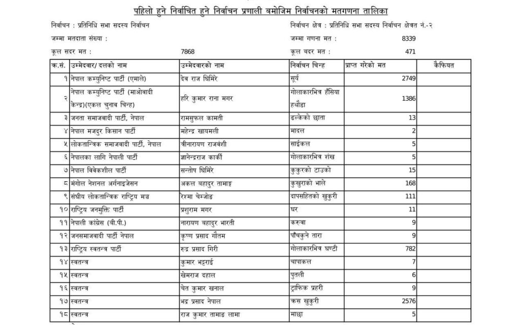 झापा , मंसिर ५ । झापा क्षेत्र नम्बर– २ मा स्वतन्त्र उम्मेदवार स्वागत नेपालले अप्रत्यासित रुपमा मत हासिल गर्दै नेकपा एमालेका देवराज घिमिरे नजिक पुगेका छन् ।