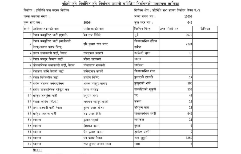 ११ हजार ६०९ मत गणना हुँदासम्म घिमिरेले ३९७० मत ल्याएका छन् भने नेपालले ३२५० मत ल्याएका छन् । उनीहरुबीच ७२० मतको अन्तर हो । माओवादीका हरि राना भने २३२४ मतसहित तेस्रो स्थानमा पुगेका छन् ।राष्ट्रिय स्वतन्त्र पार्टीका रुद्र गिरीले ९४६ मत ल्याएका छन् ।