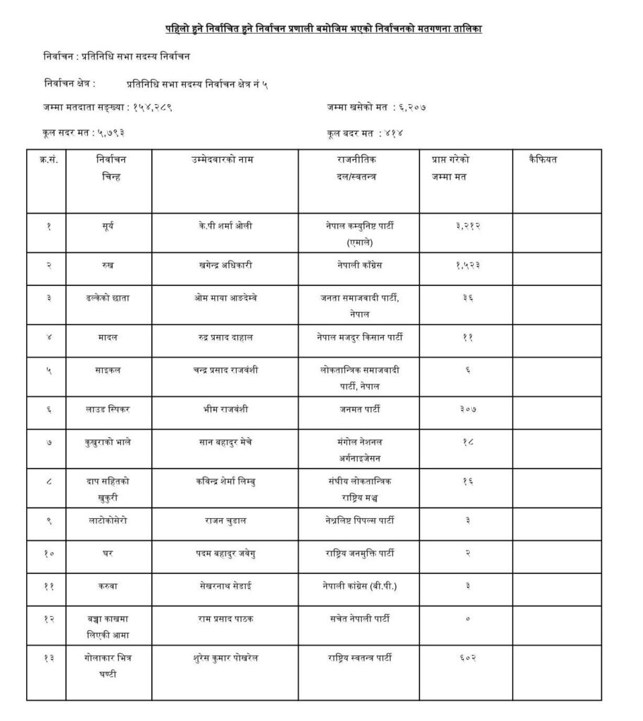 ६ हजार २०७ मत गणना हुँदा ओलीले ३ हजार २१२ मत ल्याएका छन् भने उनका प्रतिष्पर्धी नेपाली कांग्रेसका खगेन्द्र अधिकारीले १५२३ मत ल्याएका छन् । त्यस्तै तेस्रो स्थानमा रहेका राष्ट्रिय स्वतन्त्र पार्टीका सुरेशकुमार पोखरेलले ६०२ मत ल्याएको निर्वाचन अधिकृतको कार्यालयले जनाएको छ ।