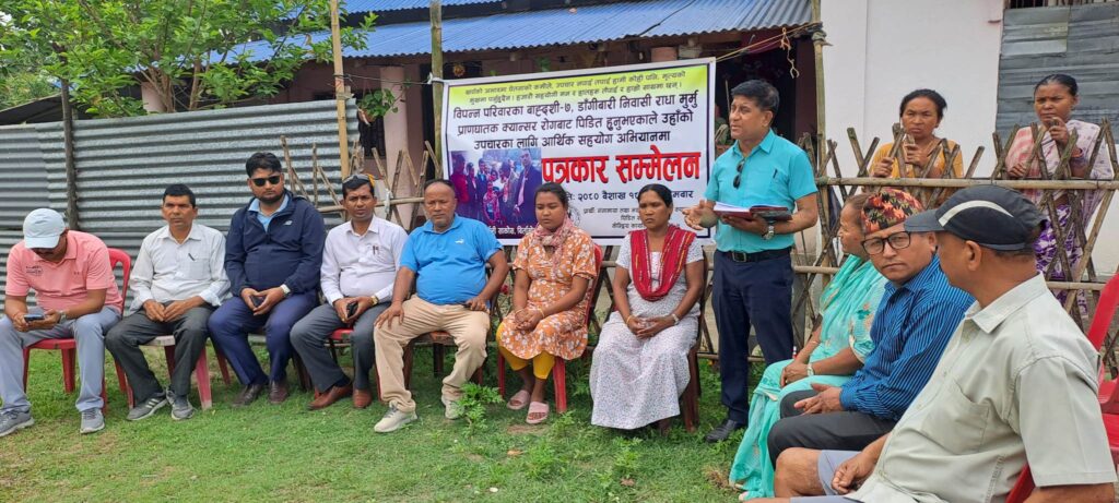 यस्तो अबस्थामा गंगामाया तथा नरबहादुर बस्नेत क्यान्सरपीडित सहयोग संस्थाले आज पीडित मुर्मूकै घरमा पत्रकार सम्मेलन गरी सहयोगका लागि आव्हान गरेको छ । संस्थाका अध्यक्ष भूपाल बस्नेतले तीनजना नाबालक छोराछोरीका लागि आमा मुर्मूको ज्यान बचाइदिन सबैसंग आग्रह गरेका छन् । कार्यक्रममा बाह्रदशी ७ का वडा अध्यक्ष मित्र भट्टराई ,बाह्रदशी जेसीजका अध्यक्ष लक्ष्मी उप्रेती ,निवर्तमान अध्यक्ष पुष्पलाल धमला , नेपाली कांग्रेस हल्दिवारीका सभापति गंगा प्रसाई ,स्थानीय युवा टंक कार्कीले आ–आफ्नो तर्फबाट सक्दो सहयोग गर्ने प्रतिवद्धता जनाएका छन् । पीडित परिवारले माछापुछ्रे बैंकमा राधा मुर्मूको नाममा रहेको ४७०५५४०१०५९५०५३४ नं को खातामा रकम जम्मा गरी सहयोग गरिदिन अनुरोध गरेका छन् ।