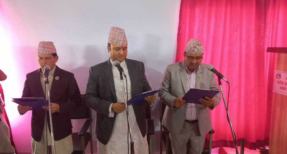 प्रदेश प्रमुख पर्शुराम खापुङ्ले आचार्यसँगै माओवादीका राजेन्द्र कार्की र कांग्रेसका रामकुमार खत्रीलाई शपथ ग्रहण गराएका हुन् ।