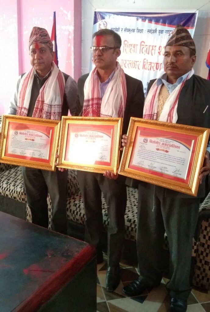 माध्यमिक तहतर्फ दुर्गा माध्यमिक विद्यालय गरामनीका लक्ष्मण सिवाकोटी, आधारभूत तहतर्फ मोहनमाया मा. वि. चारपानेका भेषराज चौलागाई र प्राथमिक तहतर्फ जनता प्रा. वि. गरामनीका डिल्लीरमण भट्टराई उत्कृष्ट भएका हुन्। नगरपालिकाको सभाहलमा आयोजित कार्यक्रममा नगर प्रमुख पवित्रा महतारा प्रसाईले सो पुरस्कार प्रदान गरेकी थिइन् । नगरपालिकाले नगर क्षेत्रभित्र रहेका सामुदायिक विद्यालयमा कार्यरत शिक्षकमध्ये उत्कृष्ट तीन जनालाई पुरस्कृत गरेको हो ।