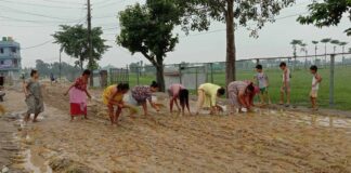 ठेकेदार सिटौलाद्वारा अलपत्र बिर्तामोड नगर अस्पताल जाने सडकमा स्थानीयले रोपे धान